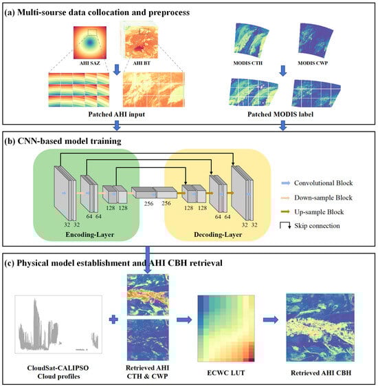 The CBH retrieval algorithm proposed in this study is a two-stage hybrid approach that integrates DL with a physical model. First, we employ a CNN model, trained with MODIS cloud products as labels, to retrieve CTH and CWP from the AHI full-disk infrared observations. Second, we establish a physical ECWC LUT from CloudSat-CALIPSO-detected cloud profiles, which maps the relationship between the CNN-derived AHI (CTH, CWP) pairs and CGT. By synergizing the CNN and the LUT, the algorithm ultimately estimates the target CBH in diurnal cycles from AHI infrared observations.