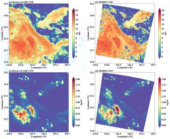 Comparison of the retrieved AHI CTH and CWP with Terra MODIS Collection 6.1 MOD06 cloud products on 12 October 2017, at 01:00 UTC. Panels (a,c) represent the CNN-based CTH and CWP retrievals, while panels (b,d) correspond to the MODIS-derived CTH and CWP labels.