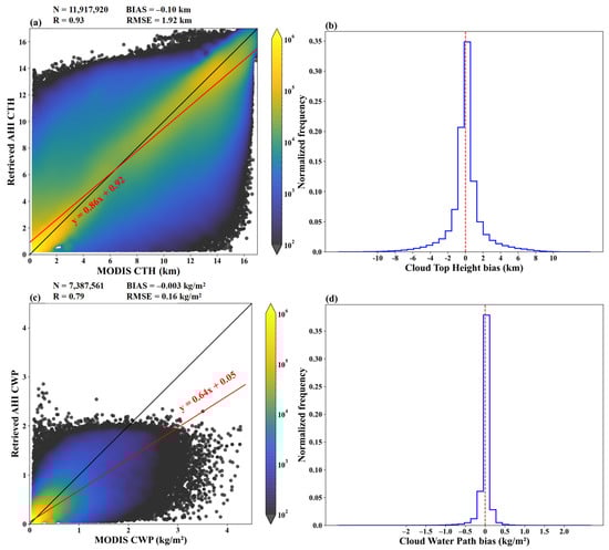 Pixel-by-pixel comparison of (a) retrieved AHI CTH and (c) retrieved AHI CWP against their corresponding MODIS labels. Panels (b,d) show the corresponding error distributions for CTH and CWP, respectively. In (a,c), the color scale represents the number of matchups on a logarithmic scale. The black solid line is the 1:1 line, and the red solid line represent the linear regression. The vertical red dashed line in (b,d) is the zero-error line. N represents the total number of points, R is the correlation coefficient, BIAS is the mean deviation, and RMSE is the root mean squared error.