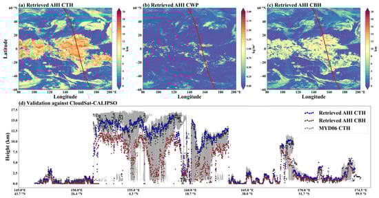 Figure 4 shows an example of CTH, CWP, and CBH retrievals based on the AHI infrared observations, with a comparison to the CloudSat-CALIPSO measurements. To provide a direct comparison, we also include the CTH product from the MODIS instrument aboard the Aqua satellite (MYD06). This choice is due to the fact that the CALIPSO flies in formation with Aqua in the A-Train satellite constellation, lagging by only 1–2 min, which ensures optimal spatiotemporal collocation. It is important to note that while the MYD06 product is used here for synergistic validation with CloudSat-CALIPSO, our model training and other analyses primarily utilized the MOD06 product.