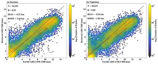 Pixel-by-pixel comparison of AHI CBH retrievals and the EarthCARE CPR measurements for (a) daytime and (b) nighttime conditions. In all subplots, the black solid line is the 1:1 line, and the red solid line represent the linear regression.