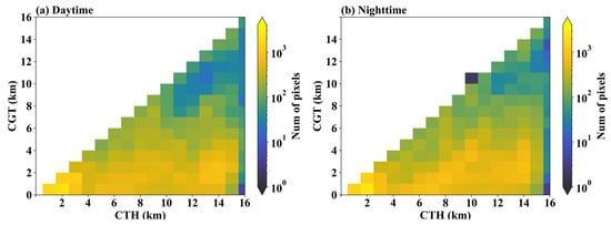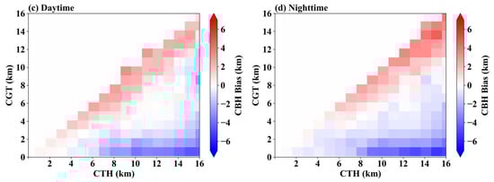 To reveal the performance of our algorithm in retrieving nighttime CBH, Figure 7 evaluates the AHI CBH retrievals using the EarthCARE-CPR measurements. The pixel-by-pixel comparisons are conducted for clouds at daytime and nighttime, respectively. The results show that the accuracy of the AHI-derived nighttime CBH retrievals (−0.35 ± 1.84 km) is slightly lower than that of the daytime CBH retrievals (−0.21 ± 1.66 km). The difference between daytime and nighttime CBH retrieval accuracies is mainly attributed to the difference between daytime and nighttime cloud vertical characteristics (i.e., CTH, CBH, and CGT).