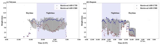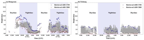 Four single-layer cloud cases for the intercomparison of the AHI-retrieved CBHs (red dots) and CTHs (blue dots) with Ka-band MMCR measurements (gray shading) at four MMCR stations in November 2022. The white/purple shading indicates the case occurred during daytime/nighttime.