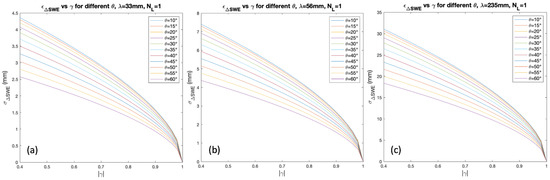 This performance analysis can be used to (i) preliminarily assess the suitability of a SAR dataset’s radiometric and geometric characteristics based on the required precision for estimation; (ii) identify pixels where estimation is reliable, based on coherence values; and (iii) provide the expected minimum theoretical error for each measurement. In practice, the latter constitutes the minimum measurable value. However, due to the characteristics of the interferometric phase, a limit on the maximum measurable without ambiguity also exists. In fact, interferometric phase measurements are limited to the principal interval (wrapped); thus PU is required to derive absolute phase values before computing through (7) [19]. The absolute interferometric phase can be unambiguously reconstructed from its principal value through the integration of its gradient, only if phase aliasing can be assumed to be absent, i.e., if the constraint can be assumed. This constraint on the phase gradient translates into a maximum SWE variation () which can be measured unambiguously. The latter can be expressed as a function of wavelength and incidence angle [27,28]: