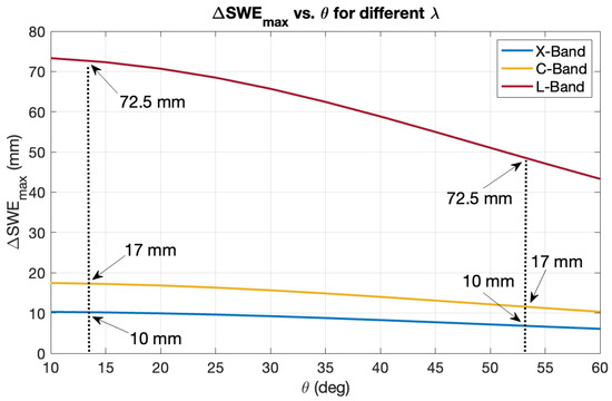 Figure 3 shows the values computed for incidence angles ranging between 10° and 60° and for wavelengths relative to the X-, C-, and L-bands (in blue, red, and yellow, respectively). As expected, performance improves—i.e., larger SWE variations can be measured unambiguously—as wavelength increases, while it slightly decreases with increasing incidence angles for a given wavelength. Indeed, the L-band is the most robust with respect to phase aliasing, leading, for example, to a maximum measurable SWE variation of about 6 cm for , which is the typical value of the incidence angle at the center of the SAR beam for many sensors.