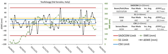 A feasibility analysis of this kind has been carried out on the Teufelsegg site, a location sited within the Val Senales test site area, equipped with in situ instrumentation and monitored for snow parameters [30], by exploiting the multi-frequency SAR dataset made up of L-band SAOCOM, C-band S1, and X-band COSMO-SkyMed (CSK) images. Between September 2021 and February 2022, independent SWE measurements were available from a permanent in situ station. Figure 4 shows the (black) and (green) time series, together with the values computed for the SAOCOM (yellow lines), S1 (orange lines), and CSK (light blue lines) SAR datasets. was computed by using the incidence angle values specific for each dataset over the Teufelsegg site and reported in the table on the right of the figure. The SAOCOM dataset is potentially able to catch all the SWE variations that occurred at that site, while for both S1 and CSK, some variations lead to aliased DInSAR phase values. Of course, measurement accuracy also depends on the time interval between SAR acquisitions, so a short revisit time improves performance. Related to this issue, the S1B failure that occurred on 23 December 2021, by doubling the revisit time, negatively impacts the SWE estimation for the following period; this situation was recently restored to a period of 6 days after the successful launch of the S1C spacecraft.