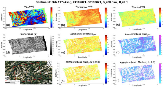 Products derived by processing S1 pair 24.10.2021–30.10.2021, acquired over Val Senales test site (location map in panel (g)) in ascending geometry (Figure 5c): (a) DInSAR phase; (b) unwrapped DInSAR phase; (c) unwrapped DInSAR phase after removal of atmospheric artifacts; (d) coherence map; (e,f) and maps masked by using layover and shadow mask (); (h,i) and maps masked by condition .