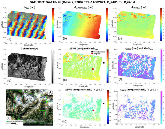 Products derived by processing SAOCOM pair 27.06.2021–14.08.2021 acquired over the Val d’Aosta test site (location map in panel (g)) in ascending geometry (Figure 5g): (a) DInSAR phase; (b) unwrapped DInSAR phase; (c) unwrapped DInSAR phase after removal of atmospheric artifacts; (d) coherence map; (e,f) and maps masked by using layover and shadow mask (); (h,i) and maps masked by condition .