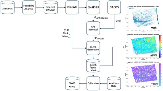 A scheme of the processing chain developed for deriving DInSAR-based SWE maps. The examples of the , , and maps refer to an interferometric pair acquired by SAOCOM over the Val Senales test site (Figure 5d).