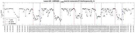 A large dataset of 345 S1 images acquired between 2015 and 2022 over the Val Senales site was analyzed to assess the feasibility of leveraging the short revisit time of the S1 constellation for ΔSWE estimation. Specifically, we estimated the average coherence over an area around the Lazaun rock glacier (Figure 5b) for each cascaded interferogram, and based on this, we computed through the model in (11) to obtain an idea of the range of coherence values expected in our test site and, accordingly, of the expected SWE precision. Figure 9 shows the trends over time in this theoretical . The vertical dashed lines correspond to the first of June (red) and to the first of October (blue) of each year. During autumn, winter, and early spring months, when snow is usually present, coherence is on average very low, leading to an expected precision of estimations of about 7 mm. Late spring and summer months exhibit higher coherence values, and thus better theoretical accuracies, but of course this is mainly due to the absence of snow. Similar results are expected on the Val d’Aosta test site. This is in fact a general critical issue for general SWE estimation in mountainous areas.
