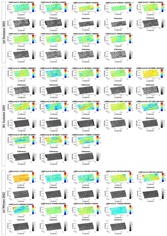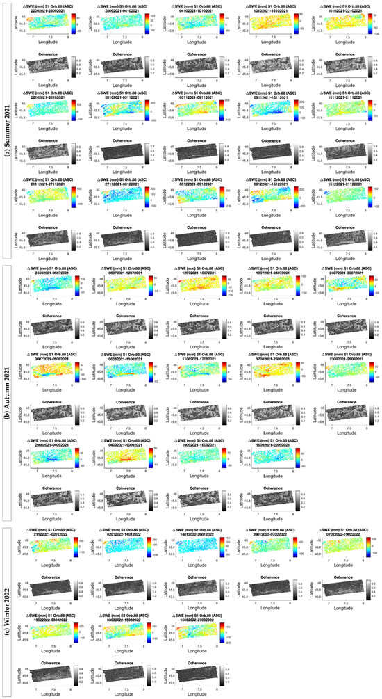 All the products generated by processing the S1 interferometric pairs listed in Table 1 are shown in Figure 10, grouped by season. The coherence map derived from the same interferometric pair is reported below each map. The maps are masked by using the layover and shadow mask instead of the full mask to avoid large voids in the maps. In fact, although the pairs acquired in summer and early autumn exhibit slightly less critical conditions, the pairs useful for retrieval, involving autumn and winter acquisitions, are generally characterized by a widespread presence of low coherence values, which compromise the reliability of the DInSAR-based SWE estimations.