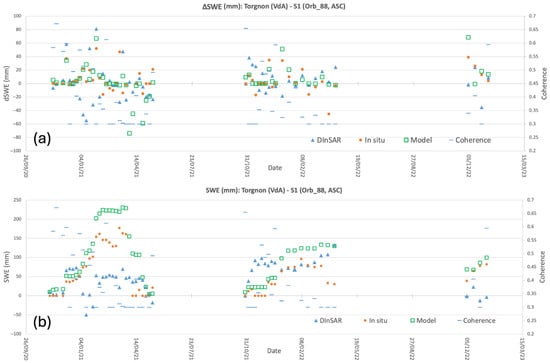 Time series of DInSAR-based (a) and estimations (b), in situ measurements, and outcomes from SNOPACK models on the Torgnon experimental station, located within the Valle d’Aosta test site. DInSAR-based estimations are derived from S1 acquisitions corresponding to the presence of snow cover according to in situ observations. For each date, the mean coherence value over the area is also reported as a dash.