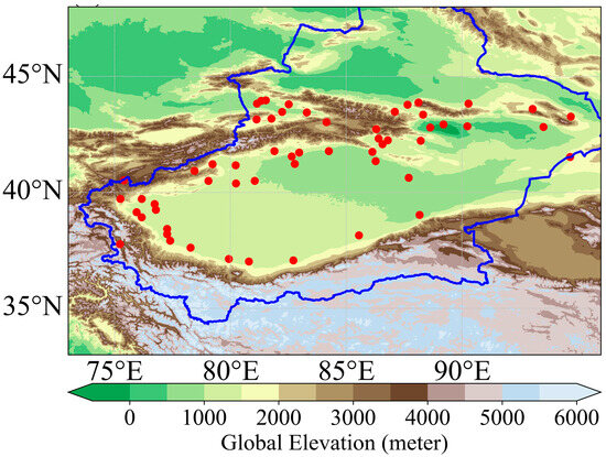Locations of the meteorological stations (red dots) in the Tarim Basin. The blue line represents the Xinjiang region.