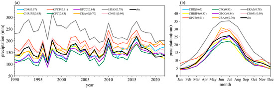 (a) Annual precipitation and (b) mean monthly precipitation of observations and eight precipitation datasets for the period of 1990–2022 in the Tarim Basin.