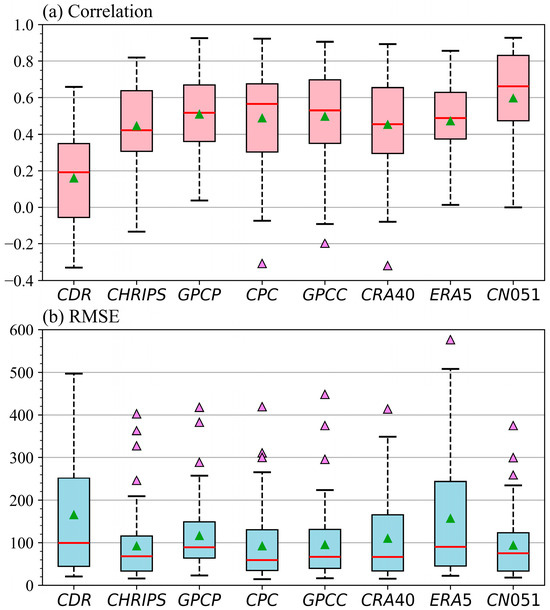 Box plots of coefficient correlation and RMSE for eight precipitation datasets at independent weather stations. Red lines in boxes represent median values. Boxes indicate the inter-quantile range (25–75%). Green triangle in boxes indicate the averages of all anomaly values. The dots represent extreme outliers.