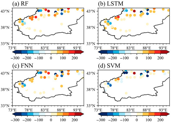 Figure 6 shows the differences between the observed precipitation and the results of M-RF, M-LSTM, M-FNN, and M-SVM. These four models generally underestimate the actual precipitation in the mountainous areas and overestimate it in other regions. Among them, the SVM model has the most significant deviation in the Tianshan Mountains, with an annual precipitation deviation of up to 200 mm. However, in the southern Tarim Basin, its deviation is relatively small. In contrast, the results of M-RF, M-FNN, and M-LSTM are closer to the observations, with differences mainly occurring at a few stations with extreme precipitation in the Tianshan Mountains. The precipitation differences at other stations are within 100 mm. Overall, the performance of the four models is not significantly different, and all machine learning models have limitations in simulating extreme precipitation values.