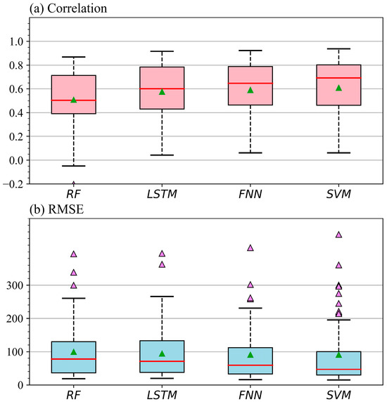 RFs can handle nonlinear relationships very well and have strong robustness against noise in the data [34]. They learn from the data by constructing multiple decision trees, each of which uses different data subsets and feature subsets during the training process [35]. In our RF model, the number of decision trees was set to 50. LSTM is a model specifically designed for processing time series data, capable of capturing the long-term dependencies of data in the temporal dimension [36,37,38]. LSTM can effectively control the flow of information through its unique gating mechanism, enabling the model to remember important historical information [37]. In this study, a fully connected layer was added after the LSTM layer to produce the result [29]. Additionally, the Adam optimizer was employed, and the mean squared error was utilized as the loss function. An FNN is a model that can learn complex mapping relationships in data [29,39]. The multi-layer network structure of an FNN can extract multi-level features of the data. In this study, the FNN consisted of an input layer, a hidden layer with 20 neurons and an output layer. The output layer had one neuron with a linear activation function to directly produce the predicted value. Finally, SVMs perform well in handling small sample, nonlinear data classification and regression problems [40]. In some cases, the sample size of precipitation datasets may be limited. However, SVMs can find better decision boundaries within the limited samples by seeking the optimal segmentation hyperplane of the data [41,42]. For our SVM model, the regularization parameter was set to 100, and the kernel function parameter was set to 0.1.