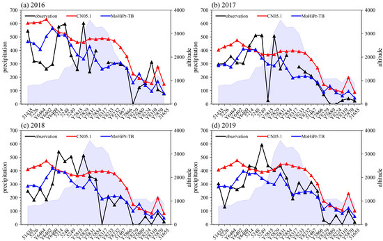 The precipitation characteristics in topographic profiles of the Tianshan area in (a) 2016, (b) 2017, (c) 2018, and (d) 2019 based on observations, CN05.1, and MoHiPr-TB. Marked lines represent precipitation, blue shading indicates the elevation.