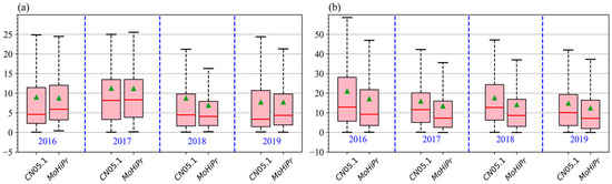 The excellent performance of MoHiPr-TB can also be seen from the absolute error of precipitation in the Pamir Plateau (Figure 15a) and the Tianshan region (Figure 15b). During 2016–2019, the average absolute error of precipitation between observations and MoHiPr-TB is not much different from that of CN05.1 in the Pamir Plateau (Figure 15a). However, in the Tianshan region, MoHiPr-TB outperforms CN05.1 significantly. Specifically, in 2016, 2017, 2018, and 2019, the average absolute error between observed precipitation and MoHiPr-TB is significantly lower than that of CN05.1, and the 25th, 50th, and 75th percentiles of precipitation absolute error are also lower than those of CN05.1 (Figure 15b). This indicates that MoHiPr-TB not only outperforms CN05.1 in simulating the relationship between precipitation and elevation, but also its bias is smaller than that of CN05.1.