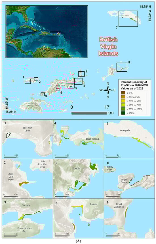 Unlike on Prickly Pear Island, distinctions of the mangroves around the salt ponds on Jost Van Dyke (Figure 3A,B, Inset Maps #1) exhibit strong recovery in both NDVI and MSI values likely due to their intact status and protected inland locations. However, large patches of mangroves on the eastern sides of Jost Van Dyke (Inset Maps 2) and Great Camanoe (Inset Maps 9) both show relatively lower recovery in NDVI and MSI values, likely due to their naturally drier climates.