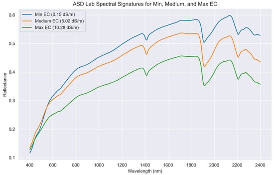 Laboratory-acquired soil spectral signatures manifested two broad absorption features at 1400 and 1900 nm, in accordance with the information found in the literature [,,]. In addition, it was possible to appreciate how different levels of salinity influenced the sample reflectance. Indeed, as shown in Figure 3, non-saline samples have the highest reflectance, progressively decreasing for moderately-saline and strongly-saline samples, with the latter manifesting the lowest reflectance. Absorption features around 1000, 1200, 1400 and 1900 nm in hydrated minerals are related to anion group vibrations. These features exhibit broad absorption due to overlapping water molecule bands in highly hydrated minerals, while less hydrated ones display narrower bands. Broad absorption bands near 1400 and 1900 nm in halite and thendarnite spectra are linked to fluid inclusions and/or absorbed water []. For all salt efflorescences, soil spectra show consistent absorption features at 1440 and 1933 nm, while for halite and sylvite it is possible to observe a trend of increasing absorption depths with increasing salt concentration []. This evidence is also supported by [], reporting the presence of major halite-related absorption features at 415 and 1915 nm, with several weak absorption regions near 494, 673, 1748, 2276 and 2385 nm. Additionally, as hygroscopic salts can absorb water vapour, soil moisture increases with increasing salinization. It is also important to take into account how the soil surface roughness influences the spectral response. For example, the reflectance for cultivated non-saline surfaces decreases because of higher roughness produced by large clods in ploughed areas [].