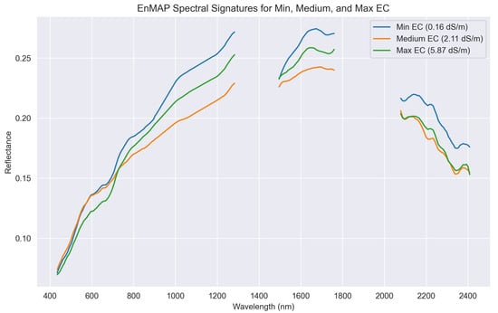 Distribution of EC values for the EnMAP-derived spectral signatures represented according to the salinity classes defined by Richards [].