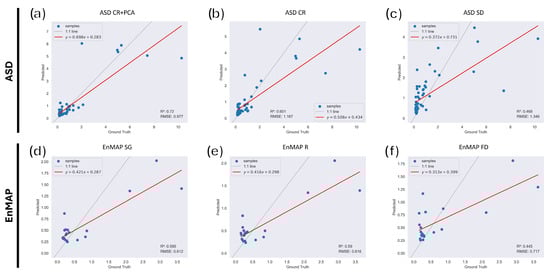 RF regression plots for the ASD (a–c) and EnMAP (d–f) datasets. (a) CR+PCA; (b) CR; (c) SD; (d) SG; (e) R; (f) FD. Dashed line represents the identity line (), red line is the fitted regression line, blue points represent the sample’s EC values.