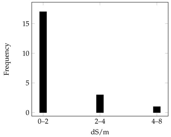 Saline soils are defined by the Soil Science Society of America as a non-sodic soil containing sufficient amount of soluble salt which could adversely influence crop plants []. Soil salinity is measured by soil electrical conductivity () computed on a soil–water paste extract or dilution (1:5) and classified according to the work of Richards []; Table 1.