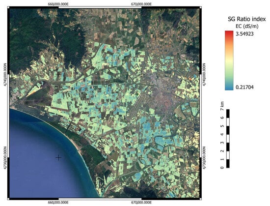 Computation of the best index–wavelength combination, RI-SG (, ), on the whole EnMAP scene [,]. The low variability in EC values highlights the index’s inability to capture spectral differences among image pixels. This insight further supports the observation that a simple combination of two spectral bands is insufficient to detect and map current levels of salinization.