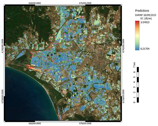 Deployment of the Random Forest regressor on the whole EnMAP scene. Model trained on the extracted pixel spectral signatures and field EC values [,]. The blue-to-red colour gradient represents progressively increasing EC values for bare soil pixels. The variability in these values, combined with field knowledge, validates the model’s predictions.