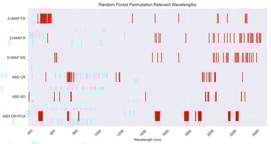 The application of PLSR on EnMAP-derived spectra did not provide satisfactory results. As can be observed by Table 6, the shows a negative correlation for all pre-processing techniques, with a maximum negative value of −3.89 for SG. In support of this result comes the RMSE, higher than any other analysis performed. Consequently to the performance highlighted by the above-mentioned statistical metrics, it comes with no surprise how the RPD actually has the lowest scores across the regression models tested, showing how the model’s predictive capability is no better than using the mean of the observations. The poor results obtained with PLSR could be linked to the EnMAP dataset size, counting only twenty-one entries.