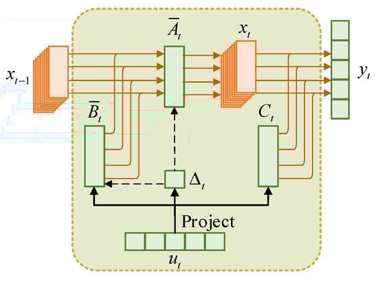 Although traditional state space models (SSMs) have achieved linear time complexity, since they are time-invariant systems, parameters , , and cannot be flexibly adjusted according to the changes in data at different time steps, resulting in an inability to accurately describe processes that change over time in the real world. To overcome this limitation, Mamba improves SSM through a selection mechanism to make the model parameters input-dependent and change with different inputs, thus turning it into a time-varying system. This can pay more attention to relevant information and provide a more accurate and realistic representation of dynamic systems. Specifically, by modifying parameters , , and to simple functions of the input sequence , input-dependent parameters , , and are obtained. Then the input-dependent discrete parameters and are calculated accordingly. The discrete state transition and observation equations can be obtained from Equation (3).