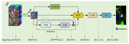 Spatial autocorrelation is a fundamental property in geographic information science and remote sensing, rooted in the principle of spatial proximity, namely, spatially adjacent units tend to exhibit higher similarity []. In HSI, this phenomenon is particularly prominent, as neighboring pixels typically belong to the same land-cover class and present similar spectral responses. Inspired by this observation, leveraging both spatial structural information and spectral characteristics from neighboring pixels can significantly enhance the classifier’s discriminative capability for the center pixel. To this end, we propose an SSAFM and an NSE strategy, which aim to improve feature representation by modeling local spatial structures and reinforcing spectral consistency. These designs contribute to improved classification accuracy and robustness in HSI classification tasks. In the proposed model, the SSAFM is first introduced to maximally utilize HSI spatial neighborhood information during feature extraction. This module directly establishes connectivity between neighboring HSI pixels in the state space by applying linear weighting to neighboring state variables within each neighborhood, thereby extracting features that incorporate HSI spatial structures. This operation enhances the model’s sensitivity to land-cover boundaries and spatial adjacency relationships. Concurrently, the SNGFM incorporates spectral information from neighboring pixels to augment the target pixel’s spectral characteristics. The enhanced features are then partitioned into small-range patches to extract intrinsic physical properties of land-cover categories, effectively reducing the impact of spatial variability on classification results. Subsequently, the FFD serves as a discriminator to assess the relative importance of spatial and spectral features. It adaptively assigns weights to the spatial features from SSAFM and spectral features from SNGFM, enabling optimal spatial-spectral feature fusion. The fused feature maps then undergo a Global Average Pooling (GAP) operation, reducing their spatial dimensions to 1 × 1. Finally, the pooled features are flattened into a 1D vector and fed into a fully connected classifier to produce the final classification results.