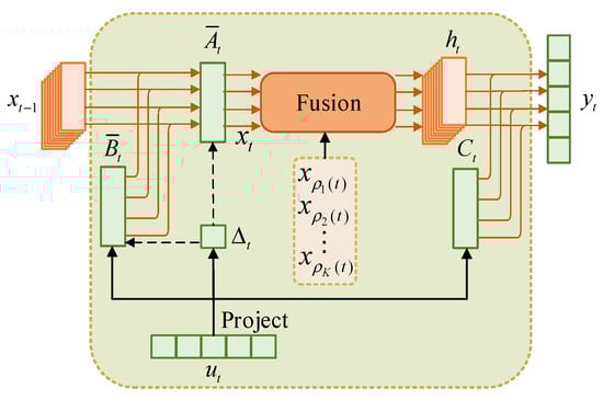 Recently, structured state space models (S4) have been actively influenced by RNNs, CNNs and the classic state space model and have shown great potential in sequence modeling. Equations (1)–(3) follow the classical Kalman filter formulation for linear dynamical systems, originally proposed in [], and later introduced into the deep learning context by Mamba []. A one-dimensional function or sequence is used as input, and the output is mapped to , , through a state variable . This process can be expressed by the linear ordinary differential Equation (1), using as the state transfer matrix, and as the projection parameters, and implemented using skip connections.