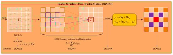 In order to make full use of spatial structural information for HSI classification, image patches centered on the classified pixels are conventionally used as input. However, the Mamba model typically converts 2D image patches into 1D sequence data and performs various scanning strategies on the 1D sequence data. This will destroy the original spatial structure of HSI and affect the classification results. In order to solve this problem and maintain the spatial structural relationship between pixels in HSIs, SSAFM is proposed. Different from the existing methods of scanning HSI from multiple directions [,,], this module introduces a new structure-aware state fusion (SASF) equation to the original Mamba, which can be described by Equation (4). The spatial dependency of neighboring features of HSI is captured from the latent state space.
