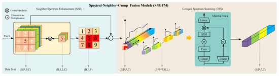 In addition to spatial structural information, HSIs also carry a large amount of spectral information. Reasonable use of spectral information can complement spatial information and improve the model’s ability to distinguish fine-grained information. The existing Mamba-based methods [,] directly use Mamba or Mamba with a bidirectional scanning mechanism to process the entire spectral data and do not use the spectral information of the target pixel’s spatial neighborhood. Since HSI has spatial variability, this will affect the model’s ability to identify substances. In addition, the spectral information of HSI contains a lot of redundant information, which will greatly increase the computational cost. Based on the above considerations, we designed SNGFM. First, the spectral information of the spatial neighborhood is used to enhance the spectral features of the target pixel. Then, in order to reduce data redundancy in HSI and facilitate the SSM to focus on subtle differences in the spectral domain, the enhanced spectral features are partitioned into groups, enabling efficient spectral information extraction through grouped scanning, as shown in Figure 5.