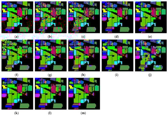 - Indian Pines: The dataset was collected by the Airborne Visible/Infrared Imaging Spectrometer (AVIRIS) sensor at the Indian Pine Test Site in northwestern Indiana in 1992 and consists of 224 spectral reflectance bands with a wavelength range of 0.4 to 2.5 μm. The image consists of 145 × 145 pixels and 16 land cover classes. In this experiment, a total of 200 bands were selected, and the noise bands (104–108), (150–163), and 220 were discarded. The pseudo-color image and the ground truth map are shown in Figure 6a,b, respectively. The number of training and test samples is described in detail in Table 1.
