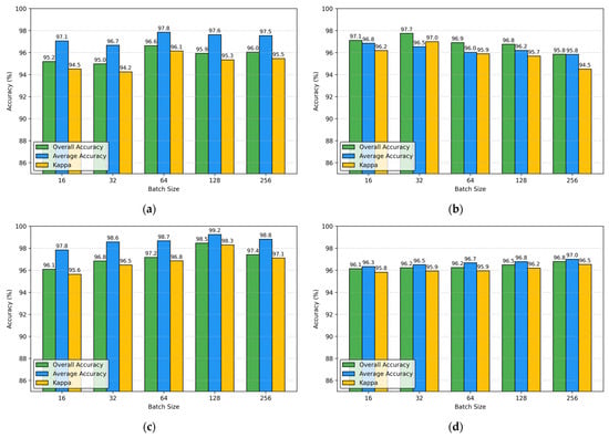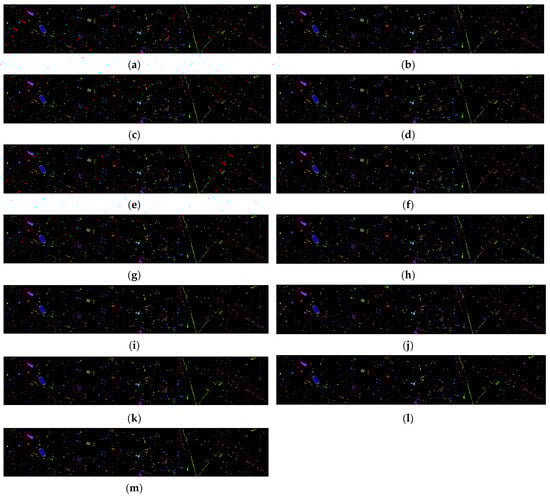 - To ensure the fairness of the experiment, all compared methods follow the optimal parameter configuration in their respective papers. For the Indian Pines dataset, the batch size is set to 64, the patch size is set to , 40 principal components are retained, and they are divided into 5 subgroups for feature extraction. For the Pavia University dataset, the batch size is set to 32, the patch size is set to , 40 principal components are retained, and they are divided into 5 subgroups for feature extraction. For the Salinas dataset, the batch size is set to 128, the patch size is set to , 40 principal components are retained, and they are divided into 8 subgroups for feature extraction. For the Houston dataset, the batch size is set to 256, the patch size is set to , 40 principal components are retained, and they are divided into 5 subgroups for feature extraction. Finally, the network is trained using the Adam optimizer with weight decay set to 0.001, and the learning rate and epoch are set to 0.01 and 100, respectively.