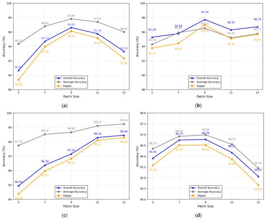 To comprehensively evaluate the effectiveness of the proposed model, four benchmark datasets were selected: Indian Pines, Pavia University, Salinas, and Houston. We selected these four datasets because they are widely used in remote sensing and cover real-world application scenarios such as agricultural monitoring, land cover classification, and urban analysis. These datasets differ significantly in terms of the number of classes, scene structure, and spectral–spatial characteristics, making them suitable for comprehensively evaluating the generalization ability and robustness of the proposed model under diverse and challenging remote sensing conditions. For each dataset, 30 samples per class were randomly chosen for training, with the remaining samples used for testing.