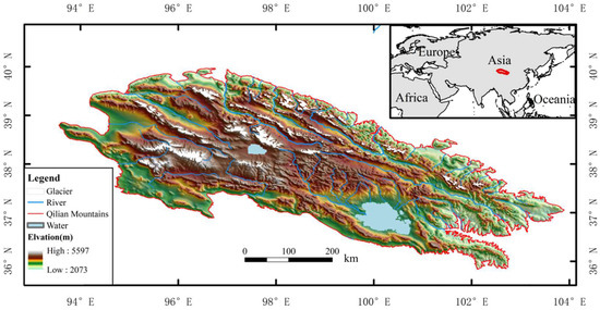 This study focuses on the QLM as the research area (Figure 1). The QLM, located in northwestern China, represents a significant mountain range on the northeastern margin of the Tibetan Plateau, recognized as a crucial ecological security barrier and water conservation area in western China, playing an extremely important role in regional ecological environments [32,33,34]. Geologically, the formation of the QLM is closely related to the uplift of the Tibetan Plateau, having experienced multiple tectonic movements and geomorphological evolution since the Cenozoic Era, resulting in the current high-elevation terrain with extensive distribution of glaciers, grasslands, and forests [35,36,37]. Climatically, the QLM is situated at the convergence zone of the East Asian summer monsoon and westerlies, making it sensitive to climate variations. The mean annual temperature has shown a significant increasing trend since 1979, with varying warming rates across different elevation zones [33,38].