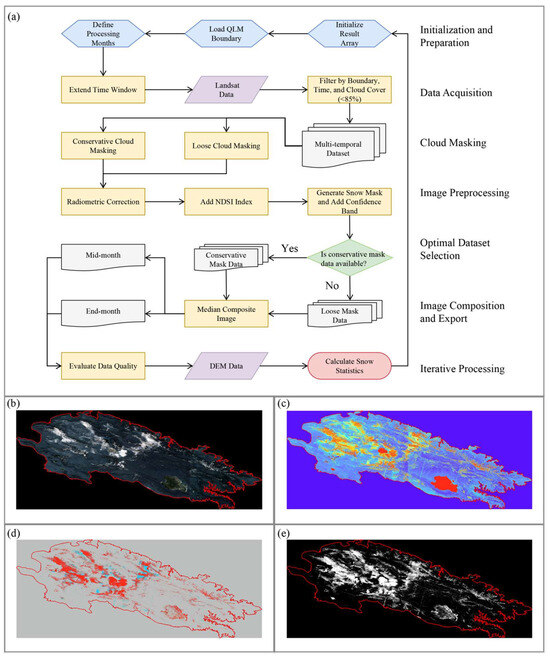 Image processing workflow and example outputs for mid-January 2024. (a) Complete image processing workflow diagram; (b) RGB composite image suitable for visual interpretation; (c) Normalized Difference Snow Index (NDSI) distribution; (d) snow classification confidence map, with red indicating high confidence and blue indicating medium confidence; (e) binary snow cover distribution, with white representing snow-covered areas and black representing snow-free areas.