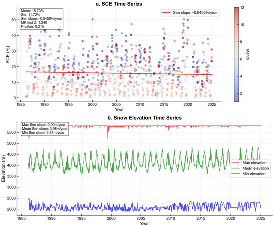 Temporal variations of snow cover extent and elevation characteristics in the Qilian Mountains from 1986–2024. (a) Time series of overall snow cover extent (SCE) showing long-term trends and variability. (b) Time series of snow cover elevation characteristics, where blue represents the minimum elevation with snow presence, red represents the maximum elevation, and green represents the mean elevation of snow pixels.