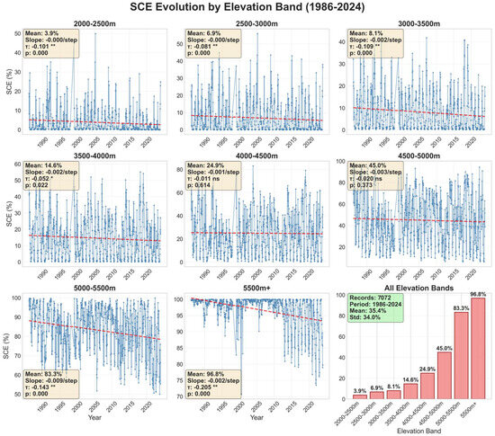 Elevation-dependent SCE analysis across eight altitudinal bands using semi-monthly data (n = 7072) revealed pronounced altitudinal heterogeneity in both magnitude and temporal trends. Mean SCE increased systematically with elevation from 3.87% in the 2000–2500 m band to 96.83% above 5500 m, demonstrating strong elevation dependency. Long-term trend analysis showed statistically significant declining patterns in lower elevations (2000–3500 m) and higher elevations (>5000 m), with Mann–Kendall τ values ranging from −0.101 to −0.205 (all p < 0.01). The 5000–5500 m band exhibited the steepest decline rate (−0.0095 per semi-monthly period), while mid-elevations (4000–5000 m) showed non-significant trends (p > 0.05), indicating relative stability in these intermediate altitudes. This elevation-dependent variability suggests heterogeneous climate sensitivity across the altitudinal gradient (Figure 4).