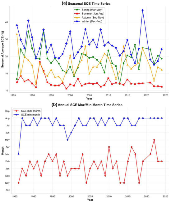 The timing of annual maximum SCE demonstrated a delayed trend, progressively shifting from November to later months, with the latest occurrence in May 2021. Conversely, annual minimum SCE timing remained relatively stable, predominantly occurring in July–August, except for an early occurrence in 1986 (Figure 5b).