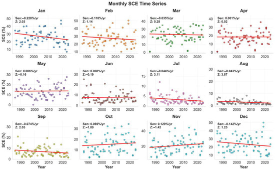 Monthly SCE trends exhibited temporal heterogeneity across the annual cycle. Statistically significant declining trends (p < 0.05) were observed in January, July, August, and September, with Sen slopes of −0.2278% yr−1, −0.0443% yr−1, −0.0428% yr−1, and −0.0737% yr−1, respectively. Other months showed non-significant trends, though transitional periods (April–June, October–November) exhibited slight increasing tendencies (Figure 6).