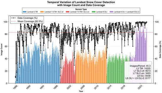 Landsat sensor usage and data quality statistics for the Qilian Mountains snow cover analysis from 1986–2024. The figure displays the temporal distribution of different Landsat sensors used throughout the study period, time series of image quantities, data coverage rate variations over time, and related statistical information demonstrating the reliability and consistency of the multi-sensor dataset.
