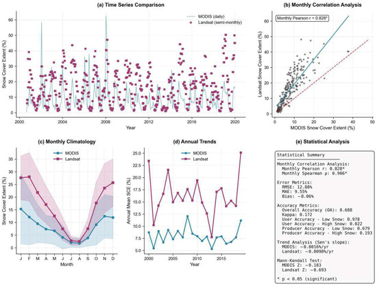 Comprehensive comparison between MODIS and Landsat snow cover extent products in the Qilian Mountains (2000–2020). (a) Time series comparison showing MODIS daily and Landsat semi-monthly data. (b) Correlation analysis with scatter plot including 1:1 line and regression line. (c) Monthly climatology displaying mean values ± standard deviation. (d) Interannual trends showing annual means with significant trend lines. (e) Statistical summary of all key statistical metrics.