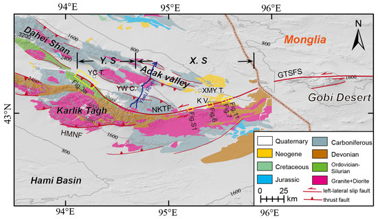 Easternmost Tian Shan is bounded by active faults, primarily NW-trending thrust faults and NE-trending sinistral strike-slip faults. Destructive historical earthquakes and prominent satellite imagery features indicate intense Quaternary activity. North of Barkol Tagh, the Jianquanzi-Barkon Fault (J-BF) comprises a NE-striking western segment displaying sinistral strike-slip motion at 2.4 mm/yr and a NW-striking thrust-dominated eastern segment [44]. Eastern of Barkol Basin, the shortening rate of the NW-trending fault-related fold is ~0.15 mm/yr [45]. North of Karlik Tagh, the NKTF is characterized by thrust movement with a vertical slip rate of 0.08 mm/yr in the NW-trending west segment and a sinistral strike-slip at the NE-trending east segment [42]. This curved fault trace ultimately merges with the GTSFS, forming a key structural transition in eastern Tian Shan (Figure 1b). The GTSFS is a prominent left-lateral strike-slip fault system in Central Asia that links easternmost Tian Shan in China to the west with several massifs of southern Gobi Altai to the east. The GTSFS comprises a complex fault system extending over 1200 km, with fault traces extremely visible on satellite images along many of its segments (Figure 1b) [28]. Geodetic studies show that the sinistral displacement slip rate of the GTSFS is 1.2 mm/yr [46]. North of Yiwu City, the Yiwu Fault is dominated by reverse motion, with a vertical slip rate of 1 mm/yr [47]. In the Adak Vally, several NW-trending active faults deform Quaternary alluvial deposits, which can be interpretated from satellite images (Figure 2). The Hami Basin North Fault (HMNF) is the bounding fault of easternmost Tian Shan and the Hami basin and is characterized by thrust with a vertical slip rate of 0.1–0.24 mm/yr. The asymmetric drainage patterns and slope gradients of Karlik Tagh and Barkol Tagh suggest more vigorous tectonic activity along the northern flank than along the southern side [22].