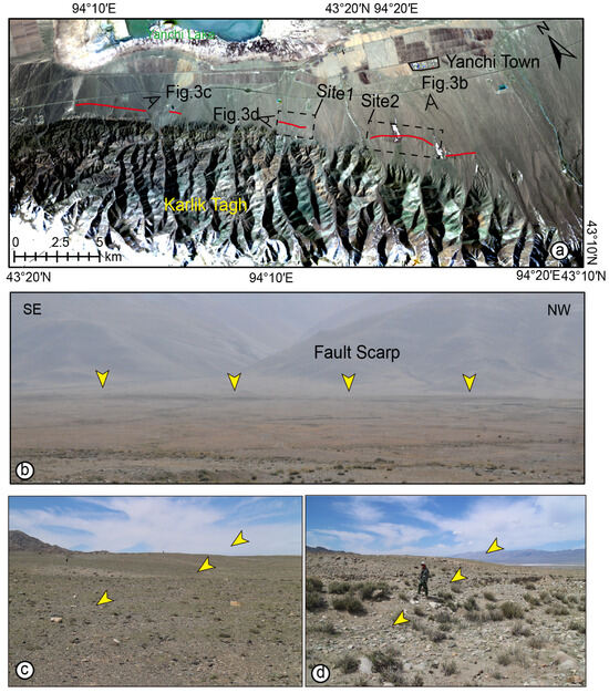 (a) Satellite image showing the fault trace of the Yanchi segment of the NKTF. The fault disturbed the alluvial fan surface and formed discontinued fault scarps. Red lines represent the fault trace. (b–d) Field photos of the fault scarp. Yellow arrows represent the position of fault scarp.