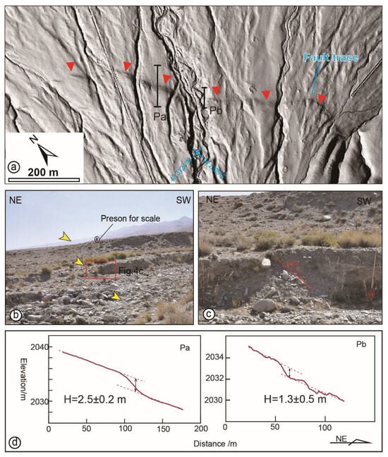 Site 1 is situated approximately 7.5 km southwest of Yanchi Town (Figure 3a), where the fault traverses Quaternary alluvial fan deposits, creating prominent geomorphic expressions of activity. The fault trace is manifested by a well-defined NW-striking scarp extending nearly 1800 m (Figure 4a–c). Topographic measurements across the fan surface reveal a vertical displacement of 2.5 ± 0.2 m (Profile Pa, Figure 4d), indicating significant cumulative slip. The alluvial fan surfaces exhibit intense fluvial dissection, with well-preserved channel terraces. These terraces are displaced by the fault, forming a scarp with a vertical offset of 1.3 ± 0.5 m (Profile Pb, Figure 4d). The fault’s kinematic character is further constrained by an outcrop exposure along the eastern bank of an incised channel, which clearly demonstrates NE-directed thrust motion along a 35° dipping fault plane (Figure 4c).